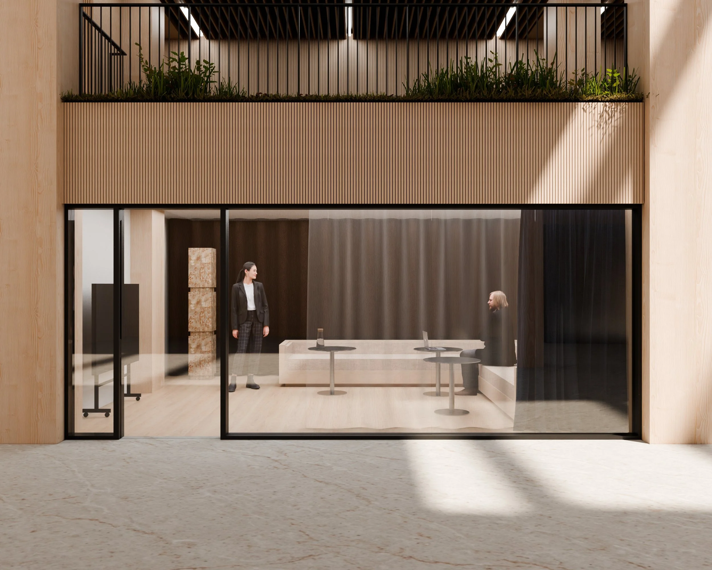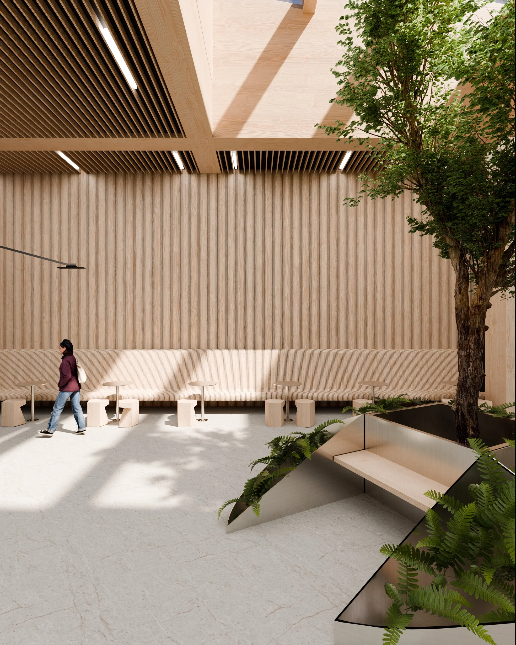Stueetagen er en udadvendt berøringsflade og udgør et socialt samlingspunkt for både husets lejere og byen. Her bydes husets lejere velkommen af den bemandede reception, og bliver samtidig en del af et pulserende miljø med hyggelige caféer og vinbarer samt butikker. Det er også i stueetagen, at husets lejere har adgang til konferencecenter, kantine og townhall.